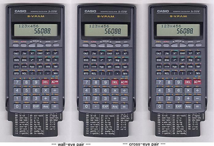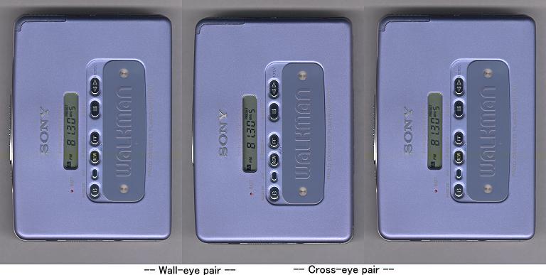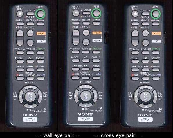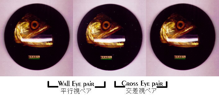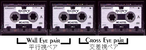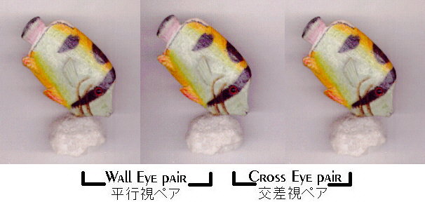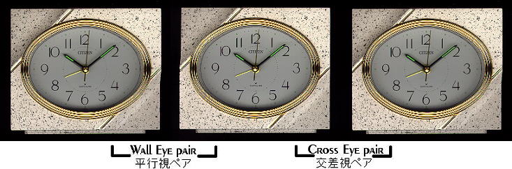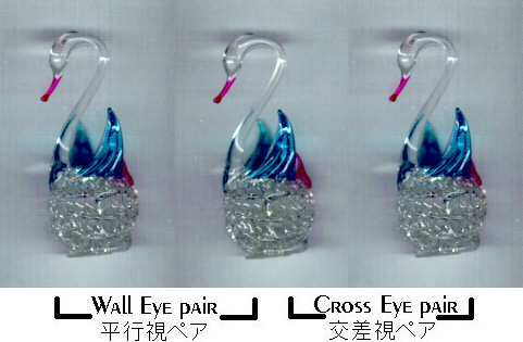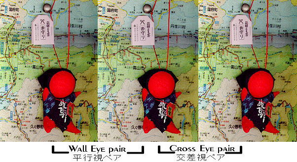 あとは並べた画像を立体視(平行視または交差視)するだけです。平行視の場合は、左目で左の画像、右目で右の画像を見るようにし(慣れない場合は絵の間と目の間に紙などのついたてを置くとよい)、交差視の場合は左目で右の画像、右目で左画像を見てください。平行視は遠くにあるものを見る視線のまま近くを見る要領、交差視はヨリ目をする要領です。 私の作成した画像を下に示します。素材が不適切なせいか、取り込み方がまずいのかイマイチ立体的ではないですが…。 備考