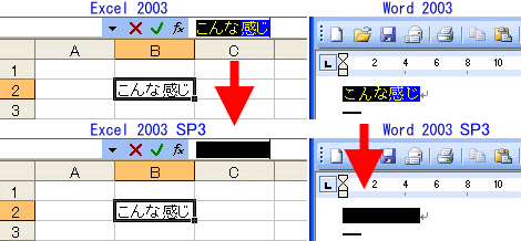 少なくとも、Office 2003で、SP3を当てて、標準のMS IMEを使わない場合(例えばサードパーティのIMEであるATOKなどを使う場合、あるいはMS IMEでもキー設定や色設定をVJEなどにしている場合)に発生するバグです。ちなみに、MSの情報でも常に発生するとは書かれていない通り環境依存するようで、自宅のOffice 2003 SP3ではWordやExcelの入力が右図に示したとおりの状況なのに対して、会社のデスクトップPC&ノートPCでは、Wordは正常(オートシェイプなどは未チェック)、Excelのセル入力では正常、グラフのタイトル文字やオートシェイプ内の文字編集の際に真っ黒という具合でした。