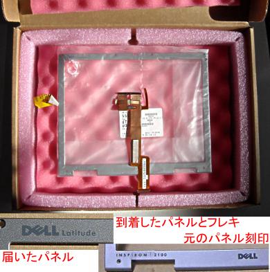 1週間後に、注文していた補修部品が届きました。なかなか綺麗なパッケージです(外は普通の段ボールですが、中は綺麗なピンクの緩衝材。おそらくどちらもリユース品;シール参照)。早速、故障原因のフレキ基板を交換。今回は、せっかくパネル枠も手に入れたのですが、割れた元の品で再生させました。枠の刻印が同機の別ブランド用(Latitude L400用)だったのと、今後の予備のために。