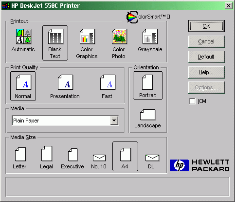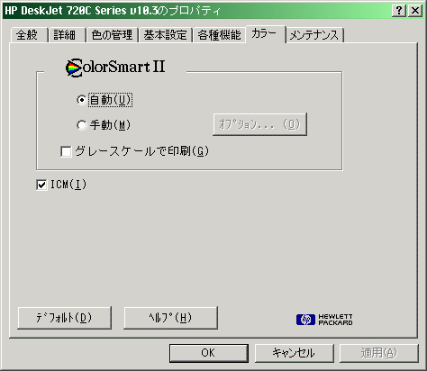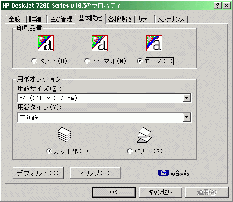 さて、ここまでの(やや長い)前振り通り、多少の不満はありつつも「まぁまぁ満足」だったのですが…、残念ながらhp社の対応に失望しました(後述の2月24日追加内容を以って、少し印象を回復しました)。これまで利用してきたhpプリンタでは専用の外観を持つドライバがありました(以下では省略していますがDeskJet 720Cのドライバ(図の(3)にある「オプション」設定でインクの濃さも調整できます)。