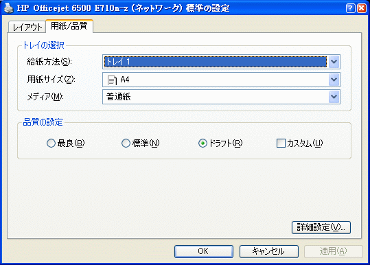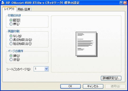 それなのに、タッチパネル(とスキャナの解像度アップ)程度しか基本的な違いがないはずのOfficejet 6500A Plusには、専用のプリンタダイアログがないのです。あるのは以下の図のような、Windows XPが用意するありきたりな殺風景な設定画面だけ。