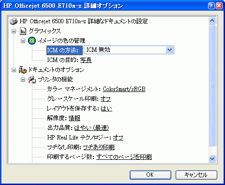 それに、今回購入した機種の前任機種であるOfficejet 6500 wirelessにもちゃんとしたダイアログがあります。コストを大削減できる高機能複合機 - 日本HP「HP Officejet 6500 Wireless All-in-One (マイコミジャーナルのレビュー記事)を参照のこと(家庭用複合機Photosmart Wireless B110aなどにもほとんど同じ画面のプリンタダイアログが存在するのです)。