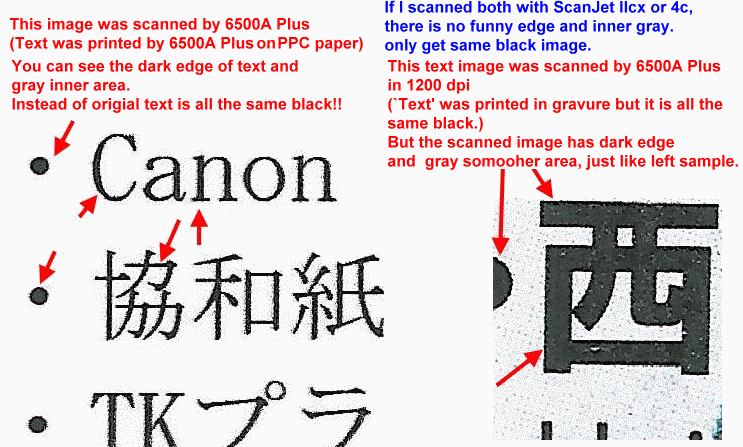 やや期待はずれ。従来から見聞き知っていた通り、CISなので雑誌などの中央のように、ガラス面から浮くと全然ダメ。縮小光学系CCDなら全然問題なくスキャンできるのに…(でもADFでスキャンする場合は特定幅だけをしっかりとガラス面に押し付けた状態でスキャンするので浮きはそれほど気にしなくて結構です)。それに設定を無効にできない過剰なエッジ強調処理がされるせいで、雑誌やグラビアのような網点印刷物を日常的に利用する100〜600dpi程度でスキャンすると、網点やモアレを強調する結果となり汚くなります(比較例:ScanJet IIcx 300dpiと、Officejet 6500A Plus 300dpi)。hp社のCISを採用した複合機Photosmart C309Gも、ITmedia +D PC USERによるレビュー記事にて「不自然に際立った輪郭」と指摘されています。1200〜4800dpiでスキャンしてフォトレタッチで網点をぼかしてから縮小すればまぁまぁ綺麗になりますが、当然スキャンに時間が掛かりすぎて実用になりません。