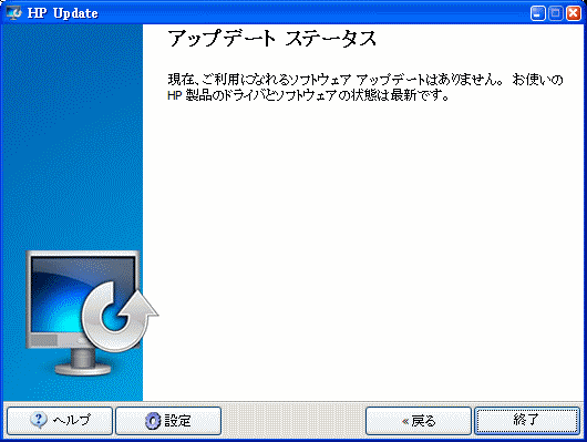 [2011-02-15 追加] 初回には敢えて書きませんでしたが、変だと思うことはまだまだあります。そのうちの1つ。ドライバやユーティリティ類を常に最新に保つためのツールと思われる「HP Update」なるものがありますが、機能しない場合があります。私が製品を購入した今年の1月上旬時点で同梱されていたCDにはVersion 22.0.0の記載があり、主要ファイルの日付は 2010-06-09。HP Updateを日を改めて(自動・手動含め)3回ほど実施しましたが、いずれも「現在、ご利用になれるソフトウェア アップデートはありません。〜略〜」の表示が出ました(右図参照)。しかし…、別の用事でhp社Webサイトのダウンロードページをチェックしてみたら、そこには「Ver. 22.50.231 公開 2010-11-11」のファイルがあるではありませんか!。つまり私が購入したものよりも新しいバージョンが、昨年中に出ていたにもかかわらず、HP Updateはそれを告げてくれなかったのです。このソフトウェアの存在意義は、なんですか? ソフトウェア側の問題なのか通信先のサーバー側の問題なのか知りませんがこれでは意味がありませんよ。
