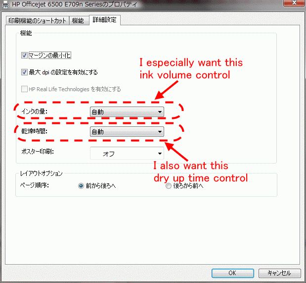ともかく新しい版があるなら…と、手動で受信してドライバを更新しました。でも、上で問題としているダイアログ画面やインク量コントロールの設定は現れませんでした(ちょっとだけ期待したのだけれど…)。