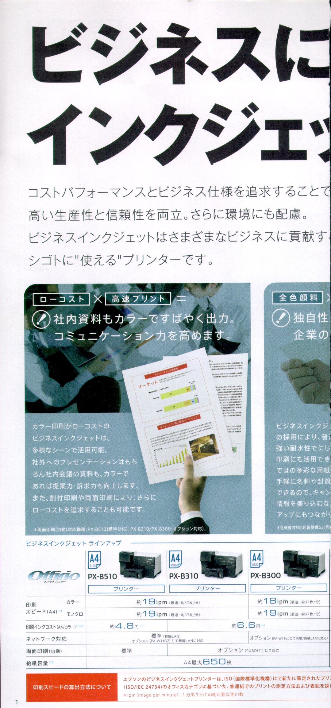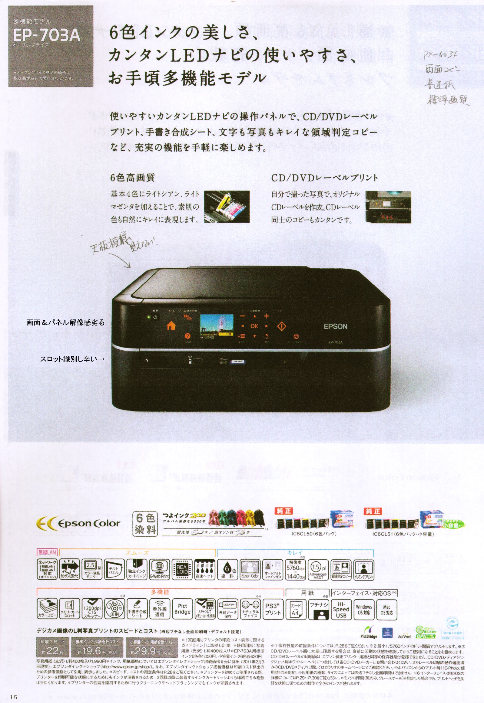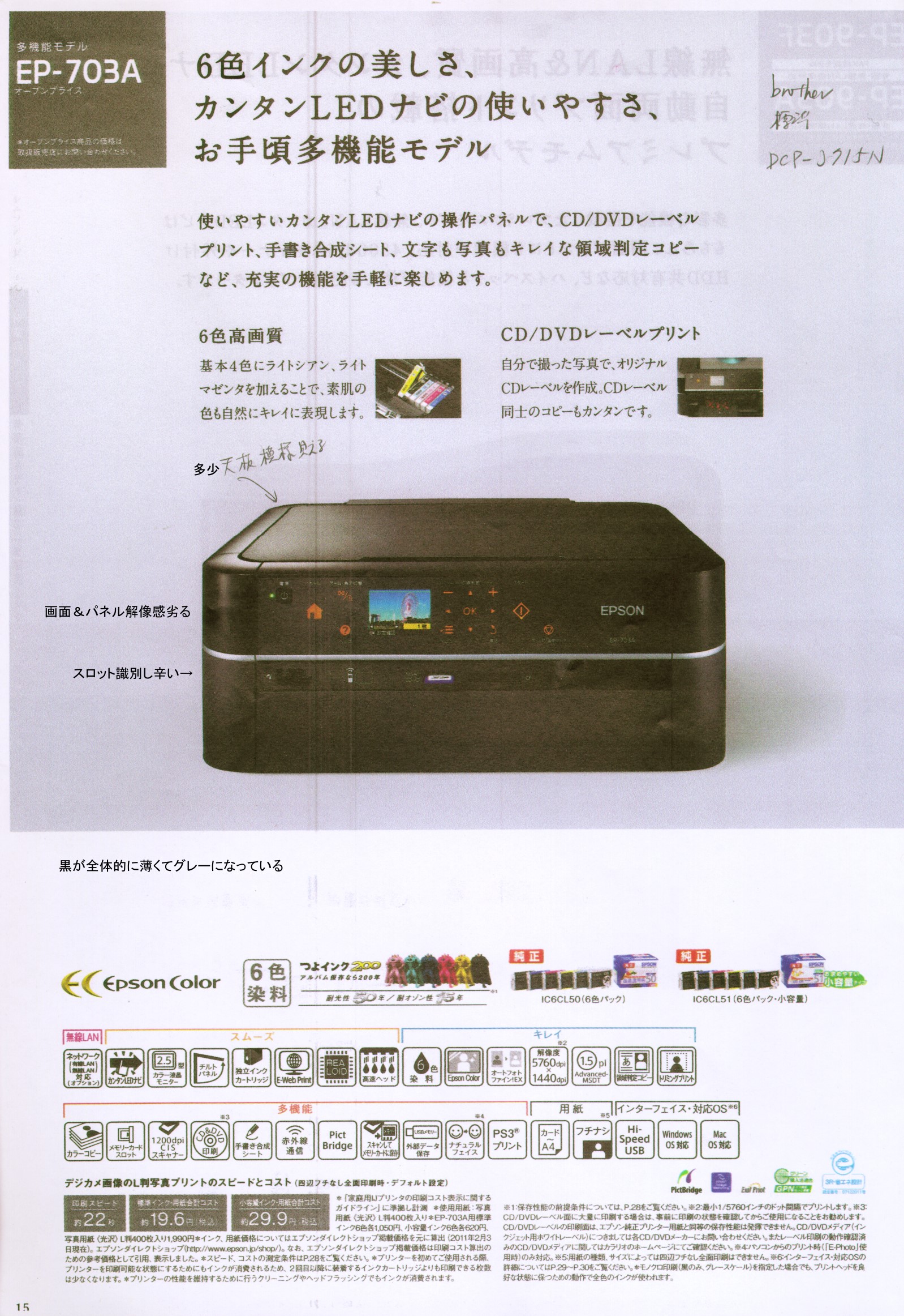 原稿はEPSONのカタログ(薄い紙の両面印刷なので裏写りします)。今回比較した機種はEPSONのEP-903A(全色染料系)とPX-603F(全色顔料系)、brotherのDCP-J715N(多分全色染料系)、hpのOfficejet6500 wirelessとOfficejet 6500A Plus(黒顔料系、カラー染料系)です(hpのOfficejet pro 8500 wireless(後日購入品でテストしました)や8500A Plus、Canon機種も比べたかったのですが、それらはインク切れでテストできませんでした。残念)。
