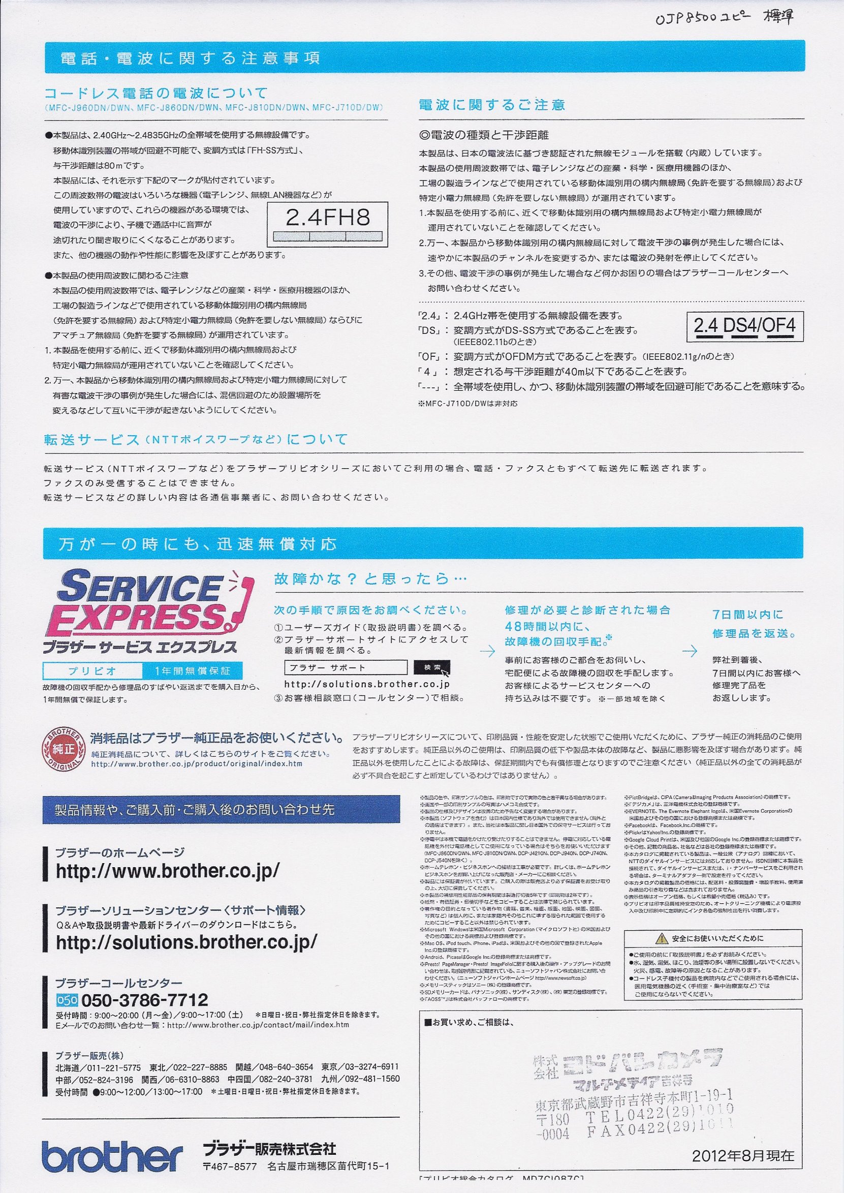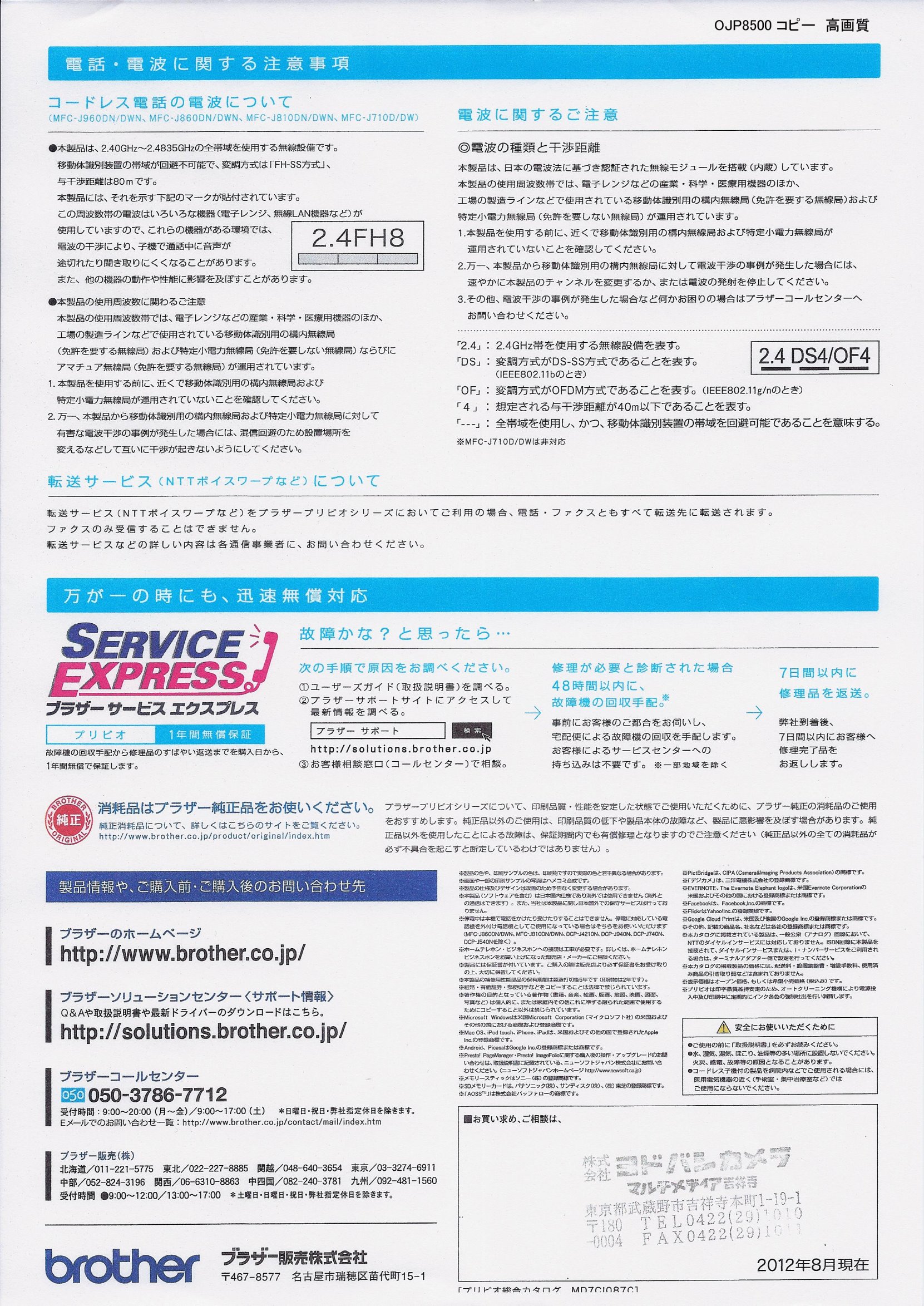 インクは従来どおりオフキャリッジタイプですが、他社に倣って(?)チップ付きになりました(brotherの従来機はチップがないから互換インクで安く…という点が受けていたみたいですが、今後はどうなるか?)。インクの容量はbrother説明員に聞いても非公開として教えてくれませんでしたが、カートリッジサイズからすればOfficejet Pro 8500(以後OJPと記す)より少ない気がします(たぶん黒が40ml在るかないか)。公称インクコストはA4カラー7.3円で一般の複合機としては安い方ですが、OJPの6.6円よりは高い[*3](brotherの説明員は「他社よりずっと安いです」と言いましたけど…)。カートリッジはビックカメラ有楽町店で大容量4色セットで8180円(記憶曖昧;Amazonでならもう少し安く買えるでしょう。ちなみにOJP用4色分は今現在Amazonで7835円)。