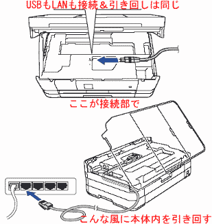 USBやLANケーブルは、本体の後ろからスキャナユニットの下方を経由して本体前上面あたりで接続する方式。brotherの従来機と全く同じで「変な」仕様。およそ40〜50cmはケーブルをムダに消費しますので注意が必要です。brotherの説明員は「接続部が飛び出さないようにするため」というけれど、単純に接続点を少しだけ窪ませれば可能なハズ。インターフェイスユニットが前面上面にあるからそこまで線をユーザー側で引っ張らせる、というメーカー論理/都合に対する詭弁に過ぎません。