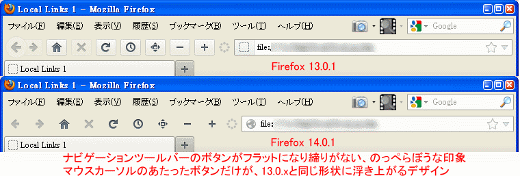 バージョンアップの激しさに関してしばしば書いていますが(2007-12-05] や [2011-03-28] や [2011-10-09])、Firefoxはもうバージョンが14.0.1。7月19日には通知が来ていましたが、本日になって更新しました。更新しての第一印象は、のっぺらぼう。ボタンの立体観がなくなったせいです。マウスカーソルを当てたときだけ13.0.1のときと同じ形状のボタンが浮き上がるデザイン。