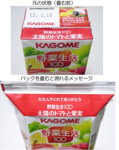 野菜ジュース系は今ではさまざまなメーカーが販売していて、古くからのカゴメだけでなく、伊藤園やキリンなども見かけます(その他もあるけど今思い出せません)。牛乳の1Lパックなどでは「たたんで開いてリサイクル」風な説明がしばしば記されていますが、250ml前後のブリックパックではスペースの問題なのか書かれていない様子。でもカゴメのブリックパックだけは、飲み終えてパックを畳むと「たたんでくれてありがとう」という上面だった部分に文字が現れるのです(底面にはない)。