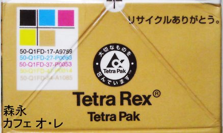 ちなみに牛乳やコーヒーなどの500ml、1Lパックでは注ぎ口部を開くとしばしば印刷の色味・位置ずれチェック用の文字やパターンがあったりします(カゴメのブリックパックの場合は底面を開いた箇所にあります)。右下2つ(アイスコーヒーのパックとカフェ オ・レのパック例)を見ると「リサイクルありがとう」の表記もあります。