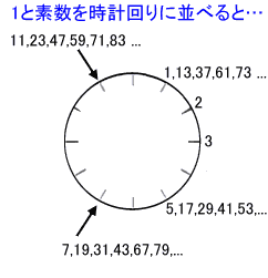ふと思い立って素数を時計の文字盤の順番に並べてみたら、文字盤の0〜11(または1〜12)に満遍なく並ぶわけではなく、1,5,7,11に集中して並ぶことに気づきました。文字盤上に並べるのは12の剰余(=12で割った余り)を求めているのと同じことなので、Nの剰余として幾つかのNで試してみました。どうやらNが偶数だと特定の数に集中し、奇数だとバラける様子。ともかく、例えば「ある数の12の剰余が1,5,7,11のいずれかならば素数の可能性がある」と言い換えることができるわけですね。素数には、ウラムの螺旋のようなある種の特徴があるので、この剰余にも何らかの規則性があっても不思議ではないのでしょうけど、今まで考えたこともなかったことなので単純に驚きました。