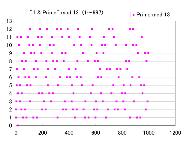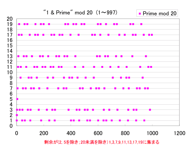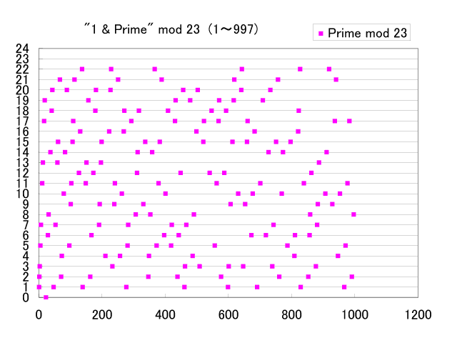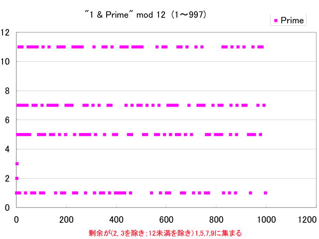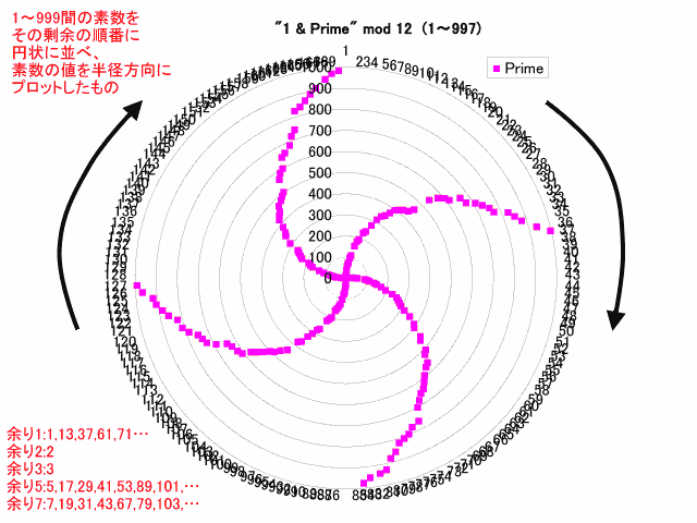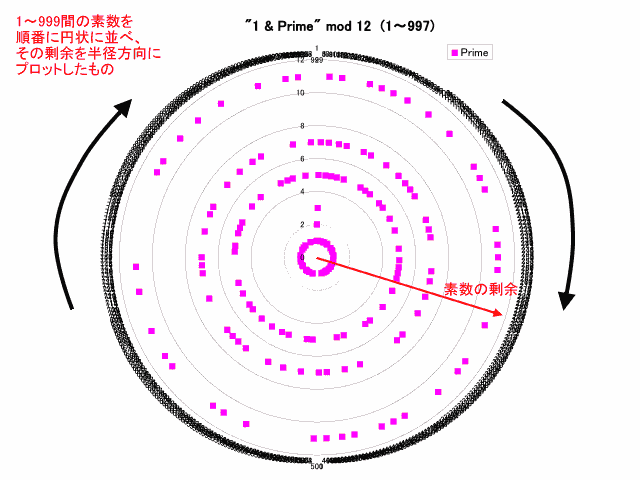 以下に示す図は順番に、(0) 時計ならびに並べた例、(1) 1〜999の範囲にある素数に対する4の剰余、(2) 12の剰余、(3) 20の剰余を順番に並べてプロットしたもの、(4) 12の剰余を円形に並べてプロットしたもの;(2)を円状に並べたことに相当、(5) 剰余1,2,3,5,7,11の順番に素数を昇順で並べたものを円形に並べてプロットしたもの、(6) 剰余13のプロット、(7) 剰余23のプロットです。クリックで元のサイズが表示されます。