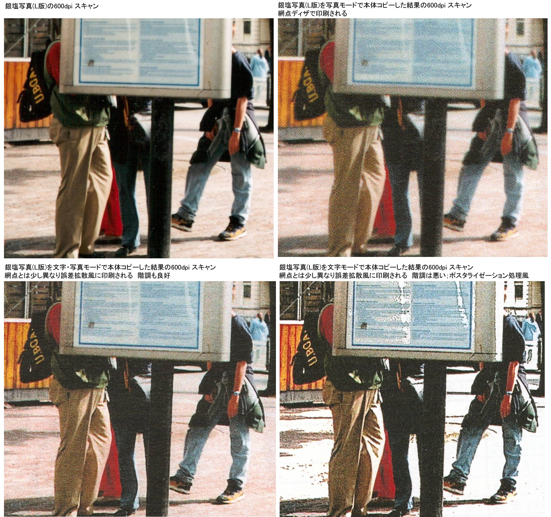 本体でのコピーの場合に、文字・写真モードにすると、網点ではなくインクジェットと同じように誤差拡散手法と似た雰囲気で印刷されました。そのためレーザープリンタでの出力なのにインクジェットで印刷したかのような質感が得られます。写真モードだと網点印刷となり、文字モードだと文字・写真・モードと同様に誤差拡散的な結果となりますがポスタライゼーション処理したように階調数が下がってしまいます。
