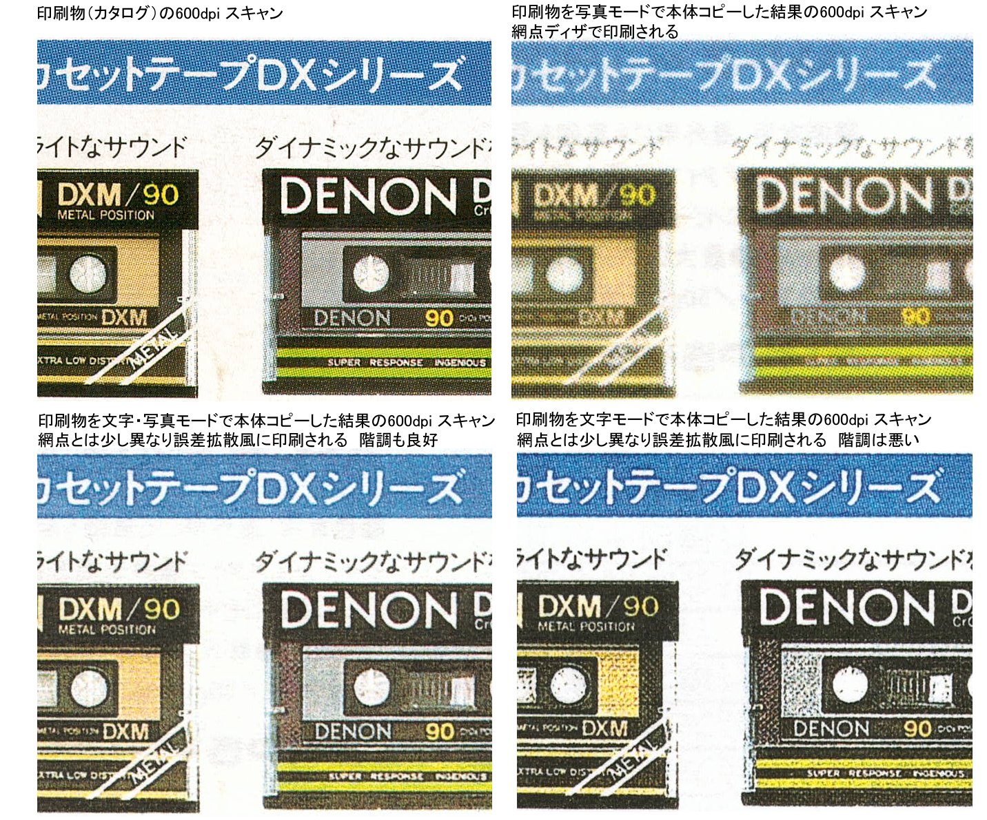 網点印刷されたカタログなどの印刷物をコピーする際は、通常文字が含まれるので、文字・写真モードを選ぶと思われますが、こちらも結果として文字・写真モードが文字もイラスト部分も写真部分も綺麗な結果となります。
