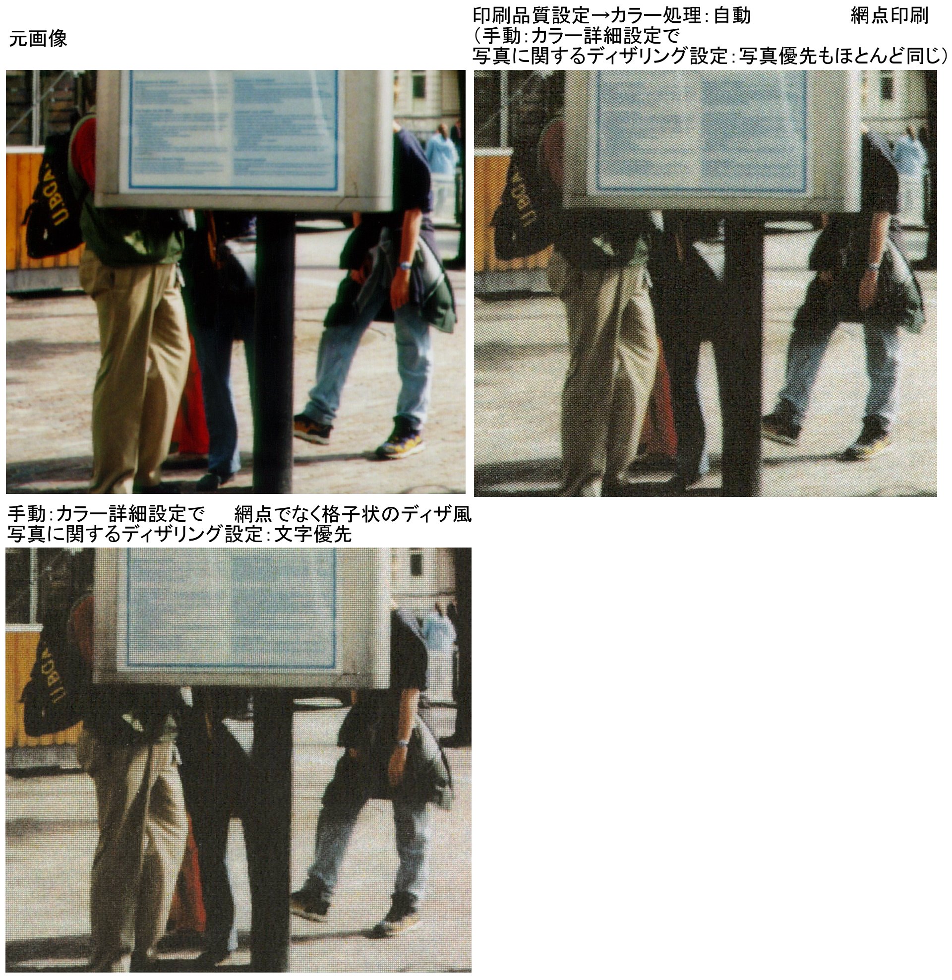 印刷品質設定→カラー処理にて、自動の場合も、手動:カラー詳細設定で写真に関するディザリング設定を写真優先にした場合も、イラストや写真などが網点で印刷されます。それに対して手動:カラー詳細設定で写真に関するディザリング設定を文字優先にすると、本体でのコピーとは少し雰囲気が違って網点ではなく、縦横の格子状のディザリング処理されたように印刷されます。格子が気になるかもしれませんが網点よりは緻密さがある印象です。