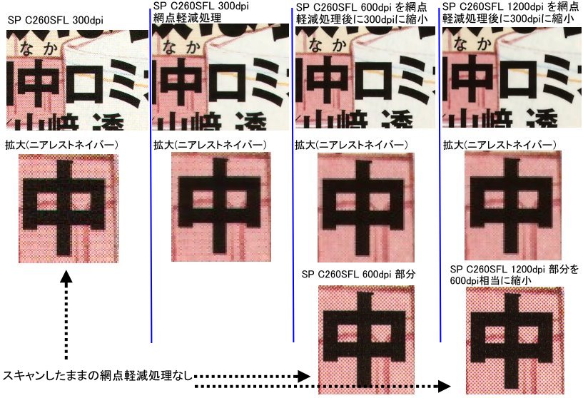 300dpi, 600dpi, 1200dpiで試した範囲での感想ですが、C260SFLのスキャン画像では過剰なシャープニングがなく、網点でも不自然なモアレが発生しないため、どの解像度でもそのまま利用可能です。600dpiや1200dpiでスキャンした後に網点を軽減するレタッチをして画像縮小すれば網点もきれいに消せます。