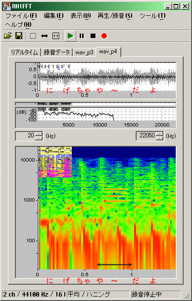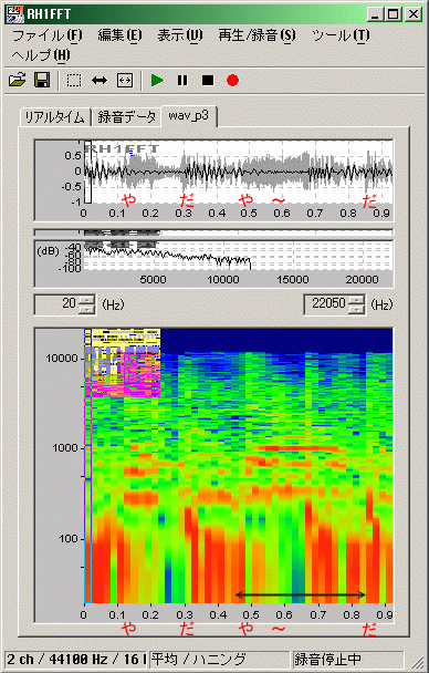 また、解析時にはWAVを使用しましたが、本説明ページで掲載している音声ファイルは、容量の都合で再度mp3に変換してあります(※抜き出したWAVファイルと再変換したmp3ファイルの解析結果の比較では、取り立てて違いが見当たりませんでした)。