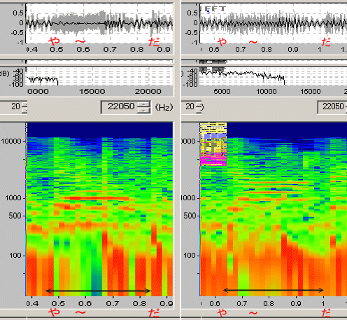 「や」の出始めから0.03秒程度で800〜2kHz前後のピーク成分(フォルマント)が現れます(「や」に含まれる母音が「あ」なので)。更に300〜400Hz付近のピーク成分が明確な違いとなっています。この成分が何に起因するのか分かりません。伴奏の成分でしょうか? それとも、「や」の発声時に「い」のような発声もするからでしょうか?「い」なら第1フォルマントが240〜300Hzあたりですが…。