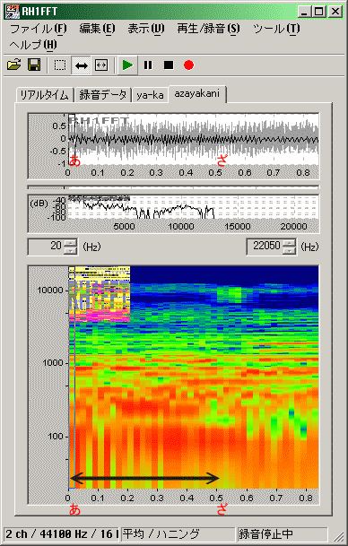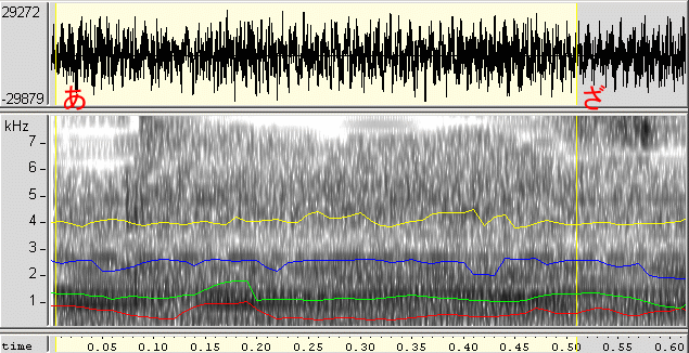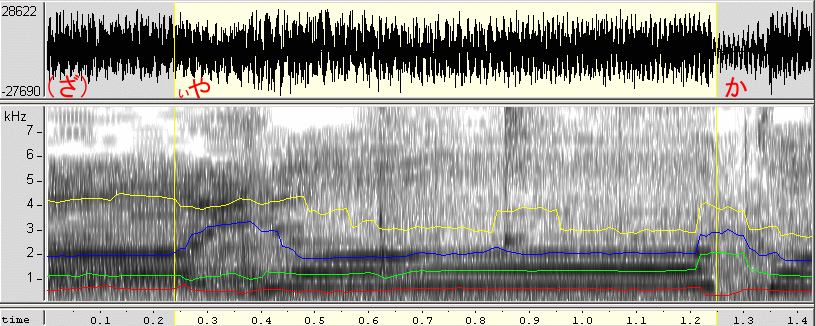 「や」の音に関して、別のサンプルも利用して、もう少し概略の特性を見てみました。利用したのは、牧野由依の「スピラーレ」のPVです(今はもう見当たらないようですが、少し前にJVCの牧野由依ページで配信されていたフルコーラスPV (WMV))。その1分07秒付近(アルバム「マキノユイ。」のスピラーレならば1分01秒付近)から始まる「あ〜ざ〜や〜か〜に〜」をサンプルとして使用しました。なお、直前の歌詞「スピラーレー」の「レー」の音声がオーバーラップしているため、母音「え」に近い成分も見えてしまう事に注意が必要です。但し、「あ〜ざ〜や〜か〜に〜」の「や〜」以降への重なりは、かなり無視できるレベルです。当然ながら、その他にも伴奏音の成分も見える点も考慮が必要です。