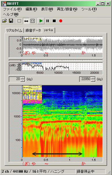 ※サウンド・スペクトログラム( Sound Spectrogram )への応用ページにある「や」「ま」「の」「て」のサウンド・スペクトログラムからも、「や」のスペクトログラムは、これまでに調べたのと同じような(左開きのラッパ型の形状)であることが分かります。