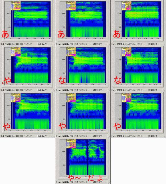 使用したデータは、「あ」の3音声、母音「あ」を持つ「や」の3音声、発音する際に「ぃや」と言うようなイメージで発音した「や」の1音声、同じく母音「あ」を持つ「な」の2音声、例のパート(4)の感じで「や〜だよ」の1音声です。