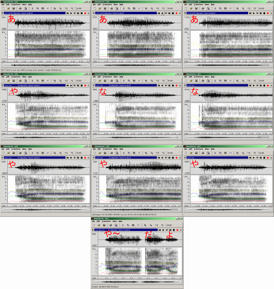 | ・WaveSurferで解析した結果一覧 (縮小図;クリックで図だけ本来のサイズで表示) ※時間幅は揃えてありません。 | |