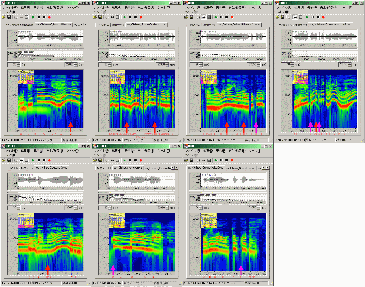 4-2の「こ」は、やや低めの声で千秋役の「こ」に似ており、特性も良く似ています。4-1, 4-3, 4-4は高めの声(4-3, 4-4は驚いたときの声)であり、別の特性となっています。4-1と4-4では後者が高めに聞こえますが、特性は割と似て見えます。4-3では右上がりの抑揚のため、基音&倍音が右上がりに変化しているのが見えます。